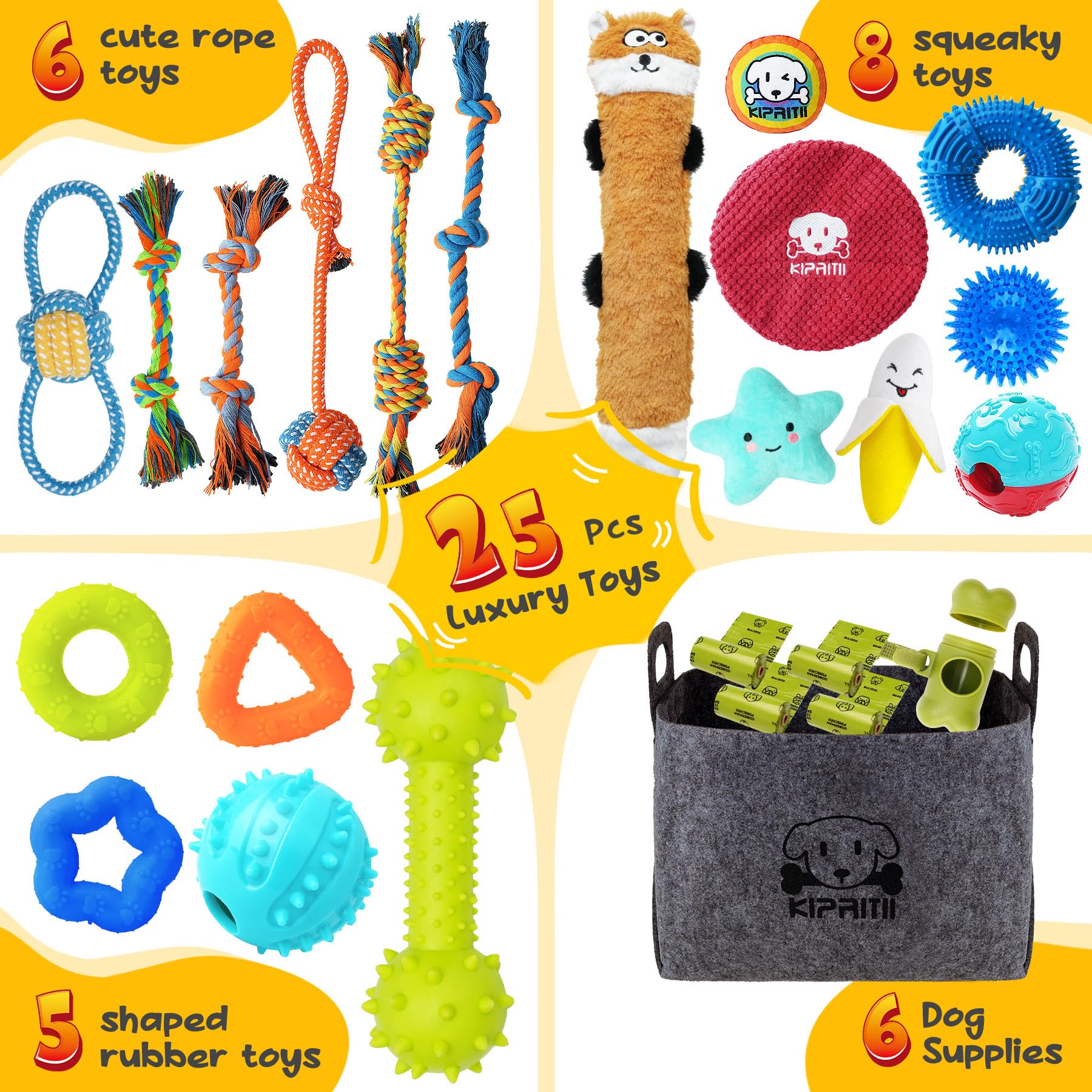 - Comprehensive Toy Set: 25 pcs various puppy toys set, includes 6 rope toys, 5 rubber chew toys, 2 interactive treat toys, 5 squeaky toys, a convenient toy basket for easy storage, 4 dog roll bags and a bag dispenser