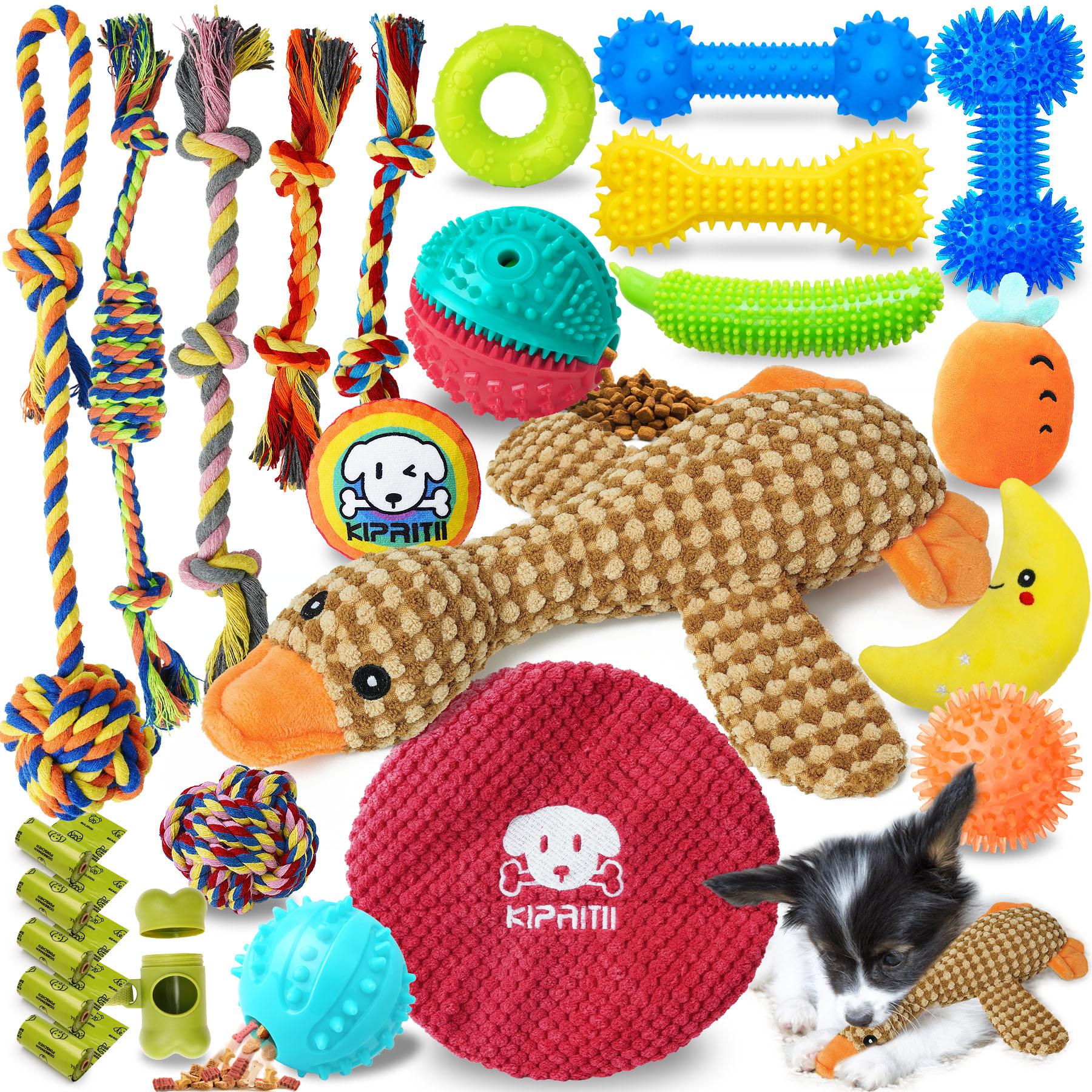 - Various Puppy Toys Pack: This 25-pieces dog toys set with 6 trendy rope toys, 5 creative plush toys with exciting sounds, 4 soothing rubber teethers, 2 squeaky rubber toys, 2 treat-dispensing toys, 5 dog rolls bags, 1 bag dispenser