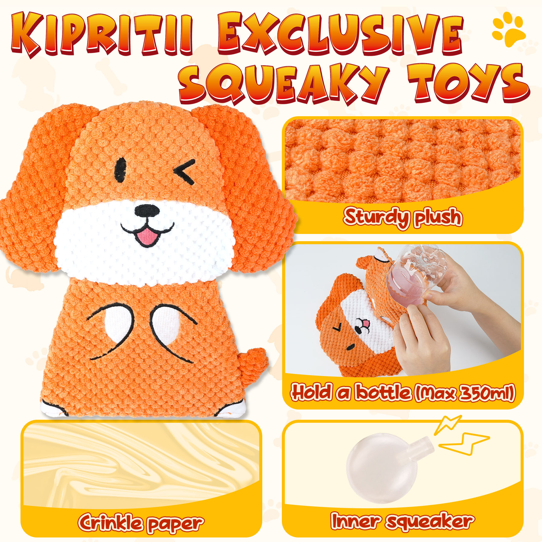 - Exclusive Puppy Toys: Our large squeaky toy features multiple sounds, an inner squeaker and crinkle paper. Put a bottle in (max 350ml) for a fun crunch. Includes Kipritii's flying disc, treat ball, and rubber toys. One set offers boundless joyous fun