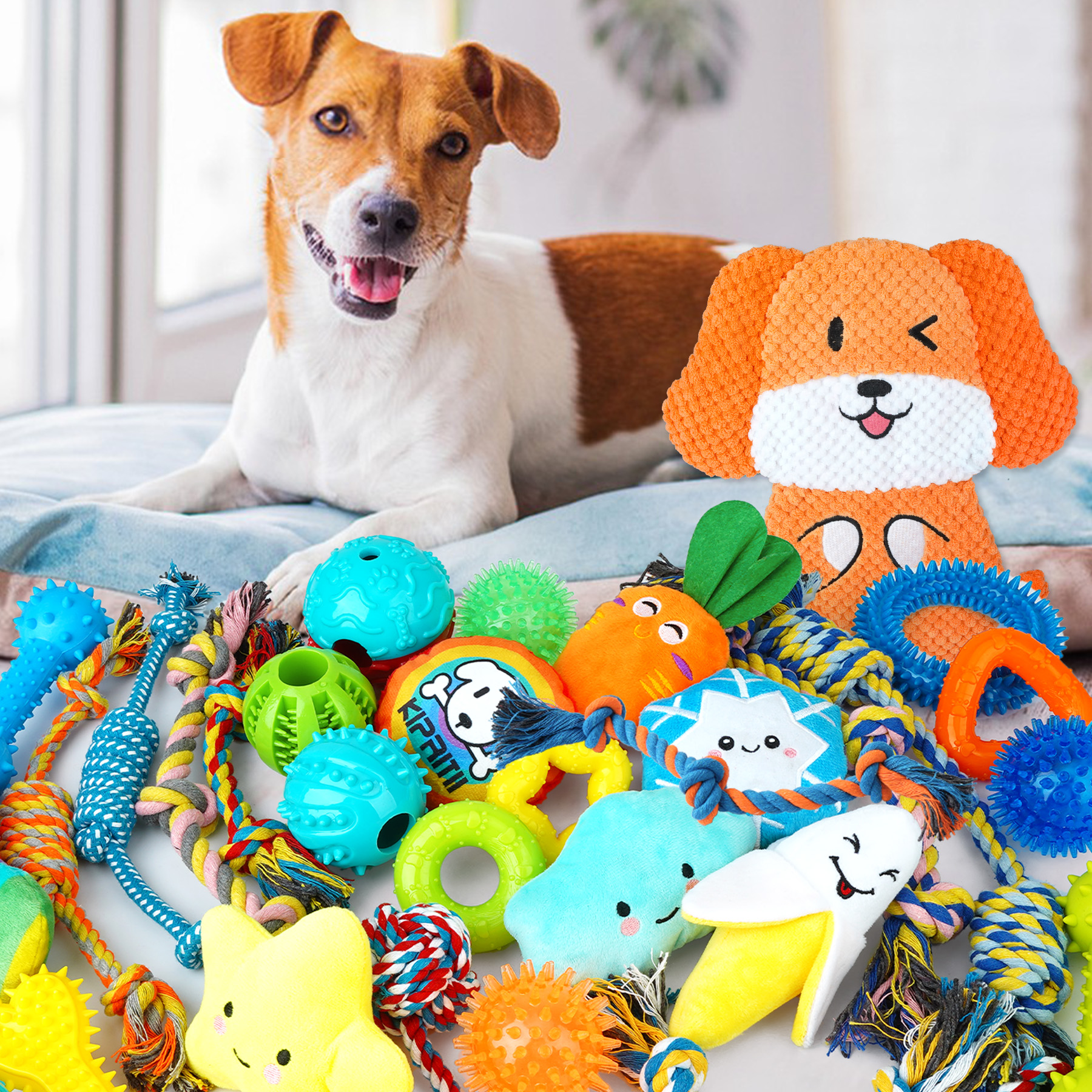 I have a (now) 9 week old Mini Schnauzer that needed some puppy toys as all the dog toys in my house are for older dogs. My Maltipoo (8 years old, weighs less than 10lbs) can take apart toys meant for German Shepard and the like dogs - no stuffy or rubber chews lasts in my house more than a couple of hours. This box of great toys are amazingly high quality. The Maltipoo hasn't been able to destroy the balls that came in the package, the baby is loving the ropes and the stuffies - the maltipoo has gotten ahold of the stuffies and they are still intact amazingly. The extra 'winking dog' that you stuff a plastic water bottle into and the crinkle paper frisbee are also winners with the baby and the older girl. Truly great quality - I went to a pet store an hour after I got the baby and 1 crinkle toy was $15; I refused figured toys weren't going to last so I'd hit the local dollar store and just replace. So happy I found this option on Amazon and made the purchase.