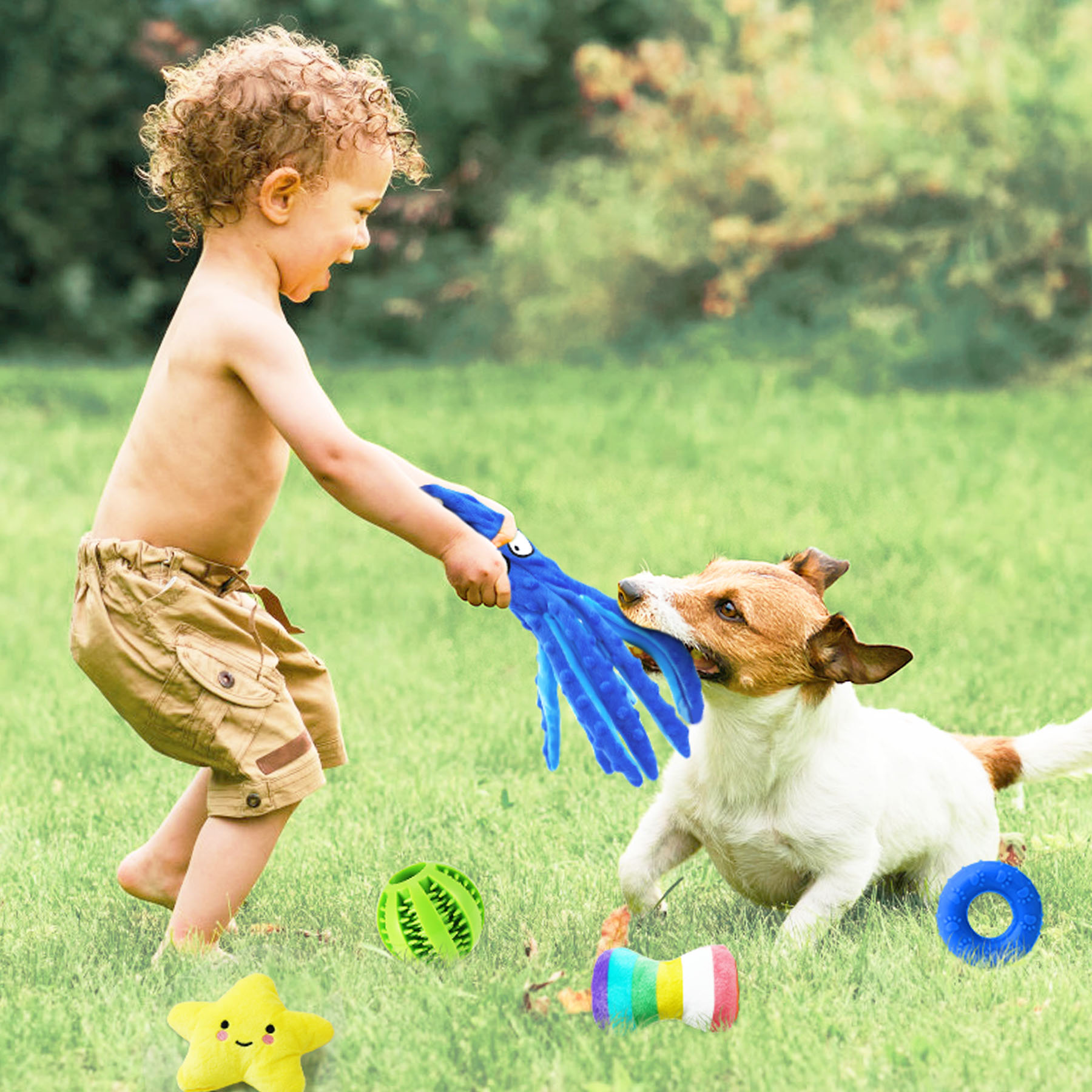 - Included Components: squeaky plush toys, rope toys, dog treat balls, rubber chew toys, dog bags