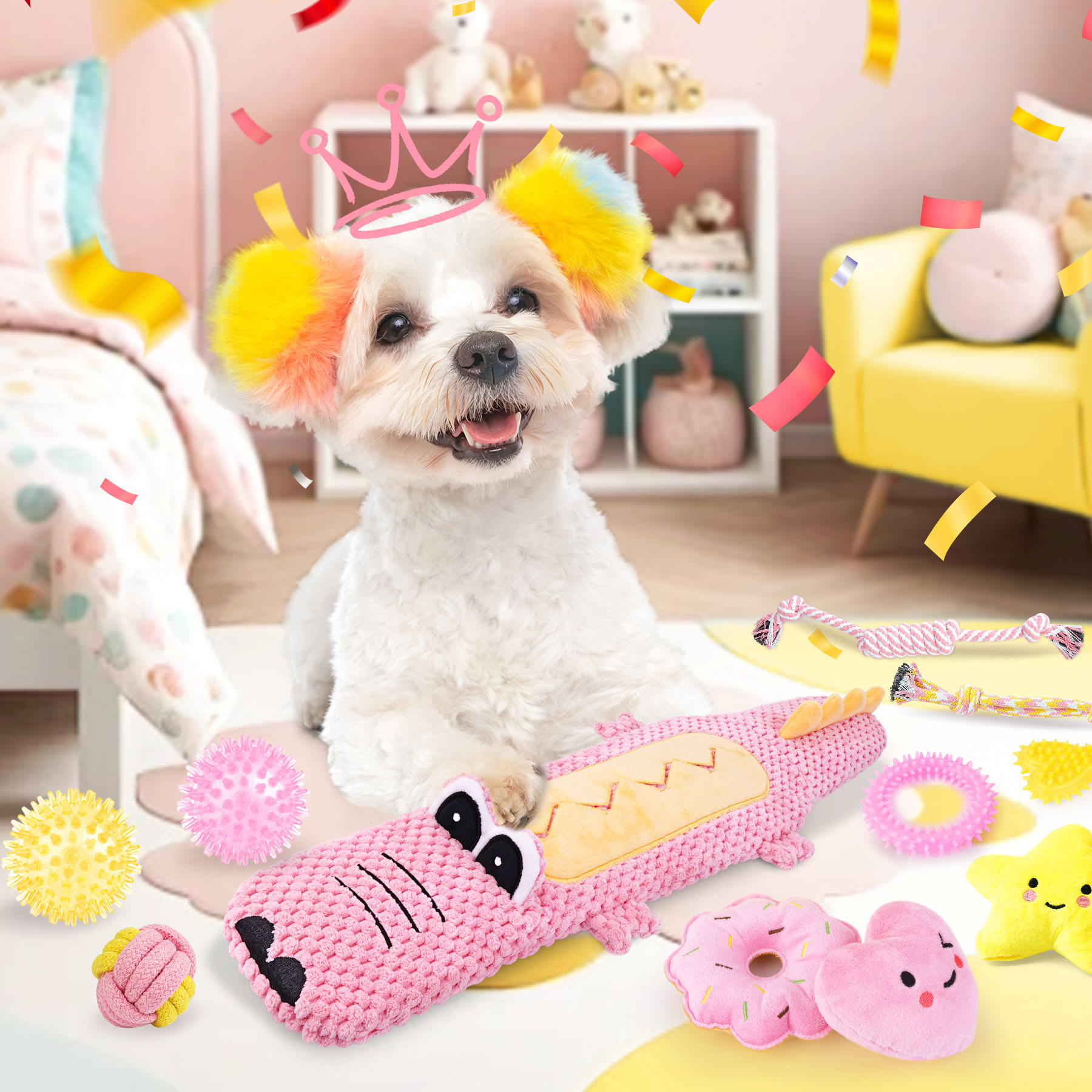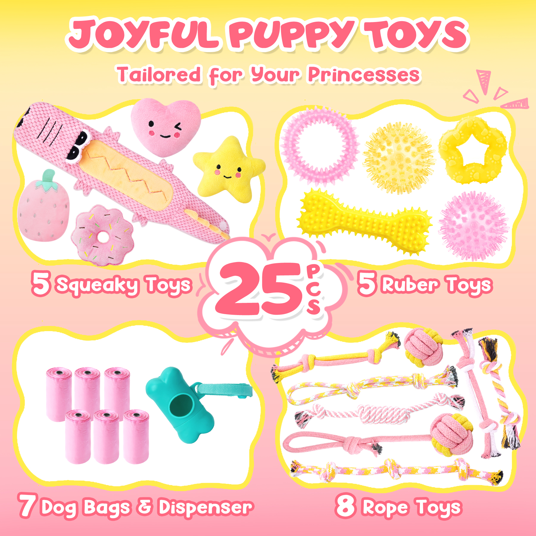 - All-Inclusive for Female Pups: This 25-pack pink toy set is tailored for your puppy, featuring a fun squeaky crocodile-shaped toy, 8 rope toys, 5 chew toys, 4 plush toys, 6 bag rolls, and 1 dispenser. all crafted to bring royal joy to your princesses-like dog