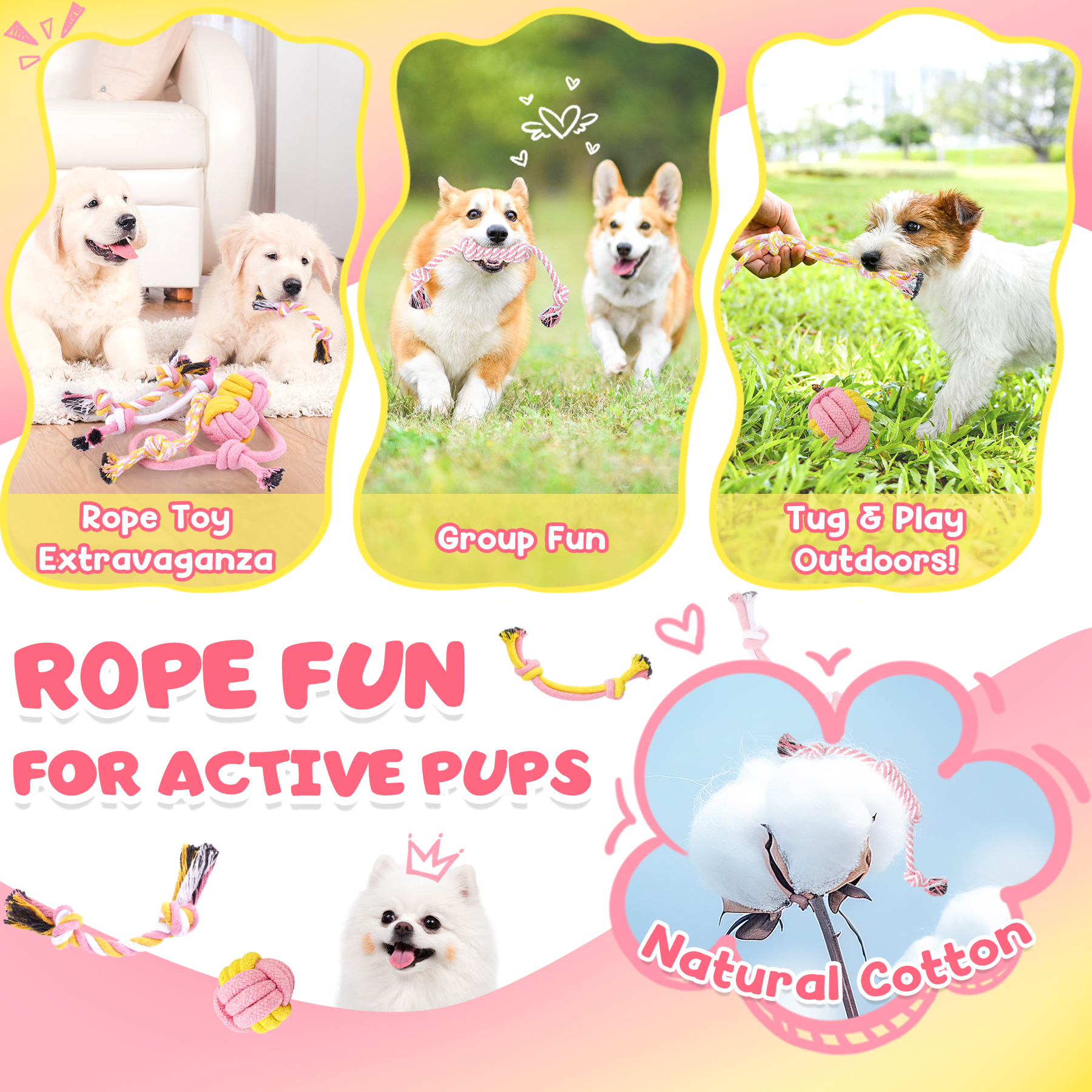 I absolutely love this set! It's so cute and the quality is really nice. The little ropes are perfect for chewing—durable enough that they won't fall apart but still soft enough for puppies to enjoy. I feel safe knowing there’s no risk of them choking on pieces. I got the pink set for my little girl, who’s coming home next week, and it’s just perfect for her
